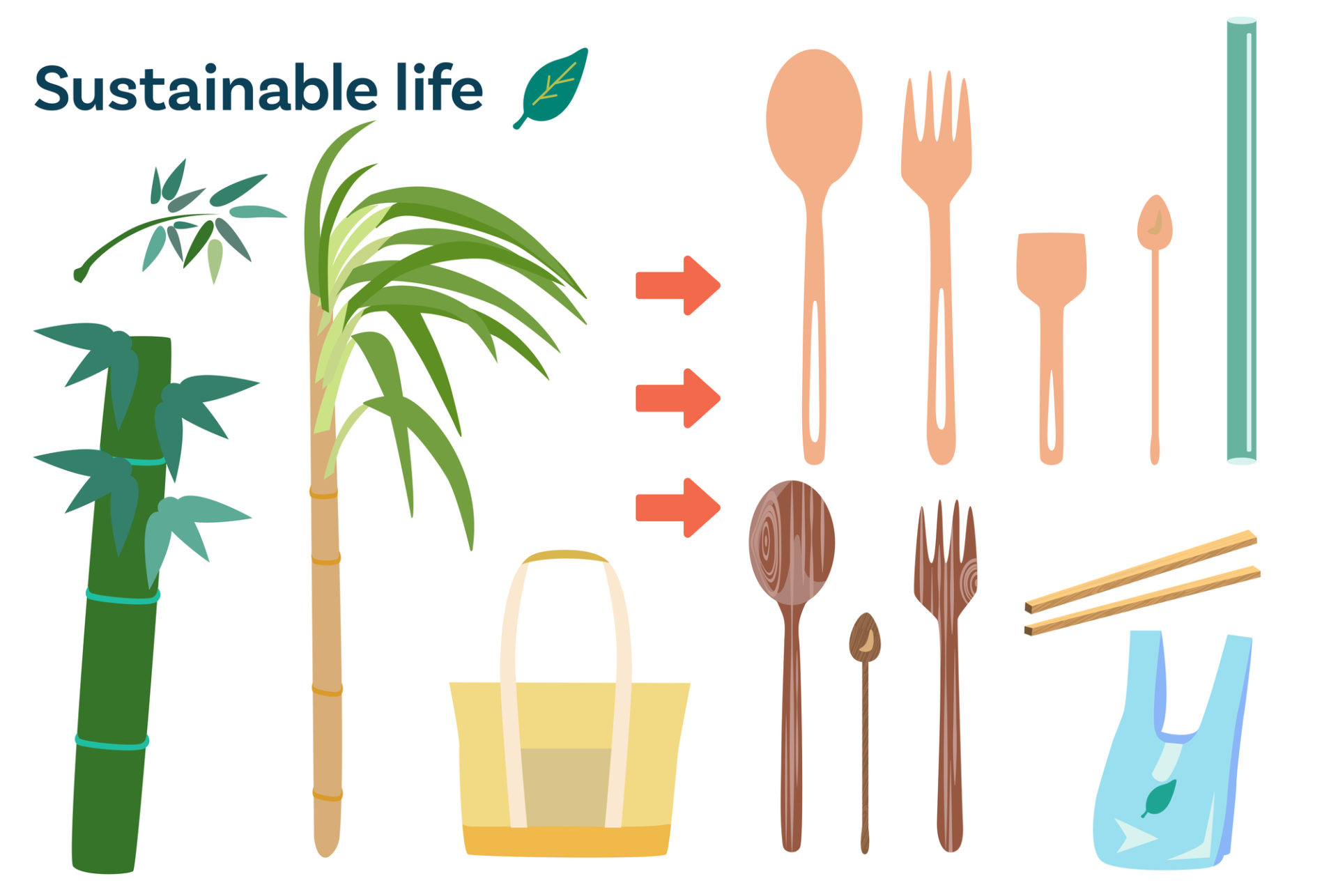 エコカトラリーは、竹やステンレススチール、バイオプラスチックなどの環境負荷の低い素材で作られており、SDGs(持続可能な開発目標)に貢献します。