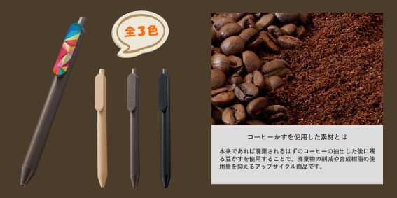 本来であれば廃棄されるはずのコーヒーを抽出した後に残る豆かすを再利用して、成型している環境に優しいボールペンです。市場では肥料にしたり、脱臭・防虫として使用するなど様々な再利用法があるコーヒーかすを原料に配合しております。 廃棄物の削減や合成樹脂の使用量を抑えるアップサイクル商品です。ボールペンの径は定番で使いやすい0.7mm、インクはブラックの単色です。本体色はコーヒーを連想するブラック、ブラウン、ベージュの3色展開です。クリップ部分が広くフラットなため、通常のボールペンより広い印刷範囲になります。 インクジェット印刷はクリップ全面にフルカラー印刷が可能のため、 会社ロゴやイメージキャラクターのデザインもでき、備品やノベルティとしてご活用いただけます。