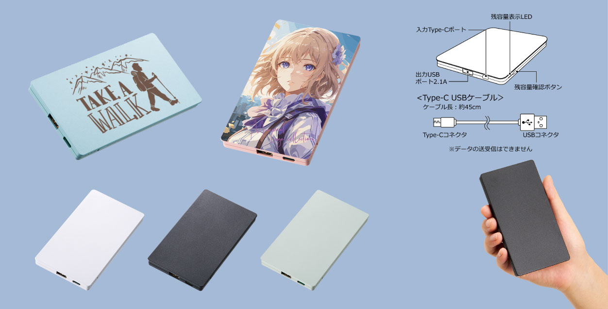 表面にフルカラーで全面印刷ができる人気のモバイルバッテリーです。バッテリー容量はお出かけ時にあると便利な4000mAhタイプ、入力ポートはType-C仕様で急速充電が可能なため、お急ぎの際にも活躍します。インクジェットでフルカラー印刷が可能です。単色シルク印刷にも対応しています。またインクジェット印刷の場合には、特殊な印刷方法で側面にインクが付かないような設計にしているため、表面全面に美しくフルカラー印刷が可能です。定番のブラック・ホワイトに加え、スモークブルー・スモークピンク・スモークグリーンのくすみカラーも展開しているため、キャラクターやアーティスト、企業イメージにあわせたカラーを選んで物販グッズやノベルティ作製におすすめです。