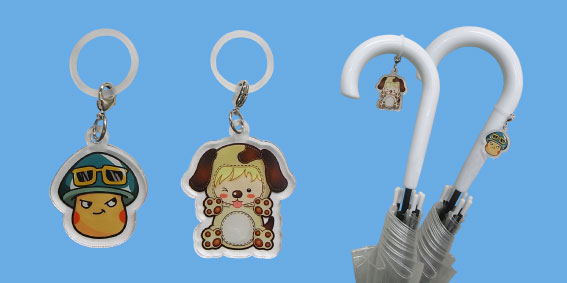 雨の日、傘立てに似たような傘がいっぱいあると自分の傘を見つけられなかったり、誰かに持って行かれてしまったりと、誰にでもそんな経験があるのではないでしょうか?そんな時、このアンブレラマーカーがあればすぐに自分の傘を見つけられて、他人に間違って持って行かれることもありません。透明なアクリルにフルカラーで好きな印刷が入れられて形状もオリジナル形状にカットできるので、バラマキアイテムとして喜ばれること間違いなしです!50個から対応可能です!